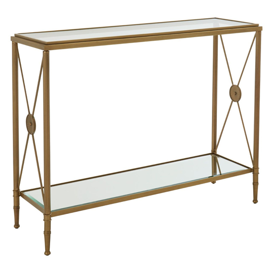 A mix of contemporary and classical design, this console table enhances architectural interest with x shaped sides. FEATURES : Material : Glass, Metal Finish : Clear, Gold This console table has a rectangular metal frame in a tarnished brass finish adding to the antique effect Supporting two-tier glass shelves, the frame features a cross design at each end which is connected with a floral motif Available at an affordable price Images shown are for illustration purpose only DIMENSIONS : Height : 78cm Width : 101cm Depth : 33cm