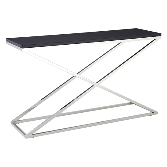 Matching a modern setting, the stylish Alena criss cross console table will make a trendy statement piece in your hallway or dining room. FEATURES : Material : Leather Effect, MDF, Stainless Steel Finish : Black, Stainless Steel Matching a modern setting, the stylish Alena criss cross console table will make a trendy statement piece in your hallway or dining room The chic design features a stainless steel frame shaped like an X that will glisten in the light Complementing the frame, a black leather effect table top further accentuates the contemporary style of the table Ideal for storing keys, loose change and perfect for displaying plants, lamps, flowers, photos and other decorative items, the table will provided a stylish storage solution A fantastic feature in your home, the Alena console table will help make your home your own Available at an affordable price Images shown are for illustration purpose only DIMENSIONS : Height : 75cm Width : 130cm Depth : 40cm
