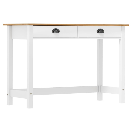 Introducing the Kendal Wooden Console Table with 2 Drawers in rich White And Natural meticulously crafted by Furniture in Fashion. This sleek and versatile piece seamlessly blends modern design with classic functionality, offering the perfect addition to any hallway or living space. Constructed from high-quality wood, it ensures durability and longevity, while the warm Brown finish adds a touch of sophistication to your decor. With two spacious drawers, it provides convenient storage space for keys, mail, or other essentials, helping you keep your space organized and clutter-free. Elevate your home decor with the timeless charm of the Kendal Wooden Console Table and add a touch of elegance to your interior. Redefine your entryway or living room with style and functionality today! FEATURES : Material : Solid Pine Wood Finish : White And Natural Our console table, featuring a simple yet timeless design, makes an excellent addition to your living room, dining room, hallway, and more The wooden table features excellent craftsmanship combined with great functionality Our console table, with its compact design, occupies very little space and fits into smaller areas Two smooth-rolling drawers offer you additional space for your ornaments, cosmetics and other private belongings This dressing table is constructed from solid pine wood for durability, giving you years of service The desk is also easy to clean and maintain Available at an affordable price Images shown are for illustration purpose only DIMENSIONS : Height : 74cm Width : 110cm Depth : 45cm