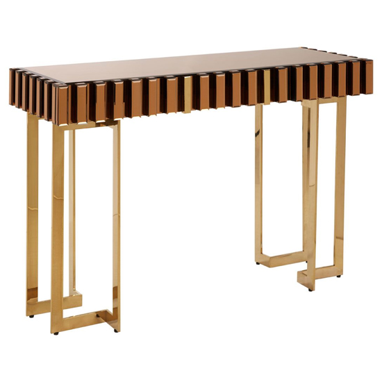 A mirrored and textured console table with stand-out contemporary luxe credentials. FEATURES : Material : Glass, MDF, Stainless Steel Finish : Gold A pane of gold coloured glass is set into the top of the Montuno console table Its sides have a corrugated design that contrasts with the smooth glass Sleek stainless steel legs have a gold finish to match Available at an affordable price Images shown are for illustration purpose only DIMENSIONS : Height : 80cm Width : 124cm Depth : 43cm