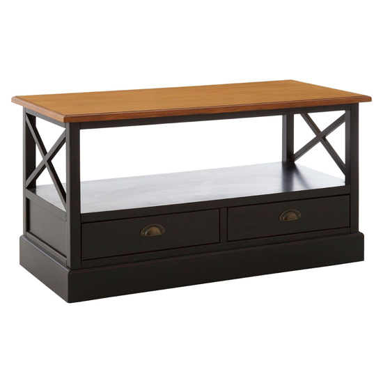 This coffee table features a black painted finish that lends a contemporary touch to its traditional design lines. FEATURES : Material : MDF, Paulownia Wood, Fir wood Veneer Finish : Black This colonial inspired coffee table has a rectangular top made from beautifully grained fir veneer Its lower section has a shelf featuring two drawers with antique cup handles Available at an affordable price Images shown are for illustration purpose only DIMENSIONS : Height : 57cm Width : 110cm Depth : 52cm